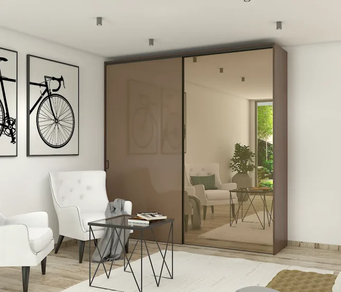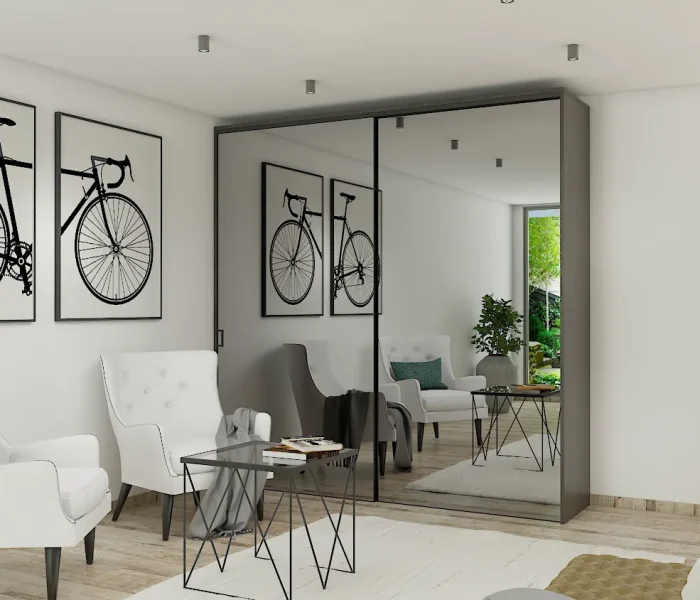 mirrored and lacquered panels give the wardrobes a distinctively smooth surface design. The wardrobes are a